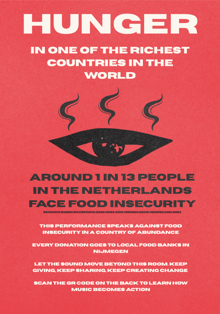 Can music feed people? It might sound figurative, poetic, or naïve, yet this question guided our intervention, The Food Bank Project, created for the course Popular Music and Social Change at Radboud University. While music is often seen as entertainment or expression, we wanted to see what happens when it becomes a tool for redistribution and care. Our project responded to Sustainable Development Goal 2: Zero Hunger, which aims to end hunger and ensure food security for all. In the Netherlands, a country known for wealth and abundance, one in thirteen people faces food insecurity (estimate based on available data from Voedselbanken Nederland & Kickstart.ai, 2024). The contradiction is striking: overflowing supermarkets next to overworked food banks. We wondered how music might intervene in this silence. Hence, The Food Bank Project set out to connect sound and solidarity. Through a concert, a flyer, and a digital toolkit, we sought to transform listening into action and audiences into allies. This post reflects on that experiment: how an artistic gesture became a meaningful act of social change, even if small.