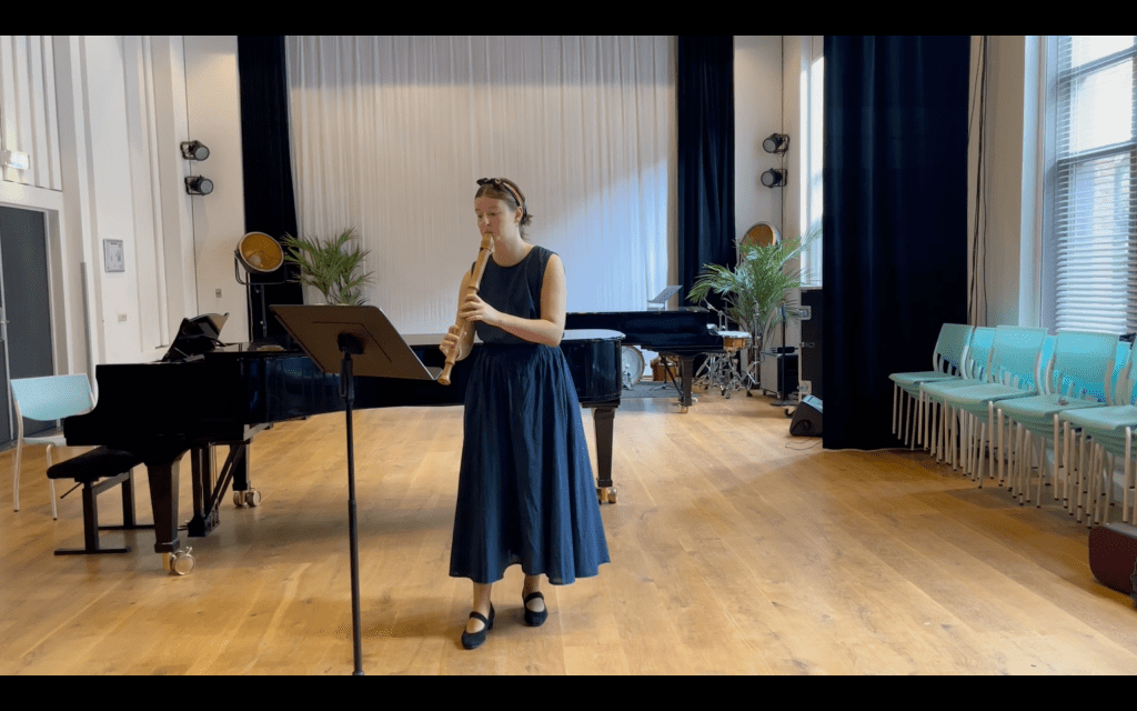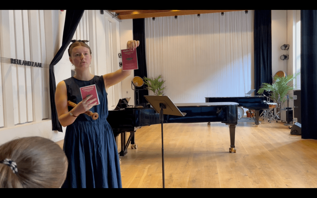 On 17 October 2025, Maike performed Laura by Jacob van Eyck, a 17th-century piece for tenor recorder chosen for its voice-like tone and introspective mood. Before playing, she introduced the issue of food insecurity and distributed the flyers designed by Hazal. Each flyer contained a QR code linking to our Toolkit for Music Activists, a digital guide on how to use music for social change and food justice, written by Hazal. During the performance, the low, resonant sound of the tenor recorder filled the classroom. Afterward, several classmates approached Maike to express appreciation, not only for the music but for the message. Sven (a classical piano student) noted that she explained the topic very well and that he liked the flyer’s design. The combination of performance and information seemed to land well with the group.