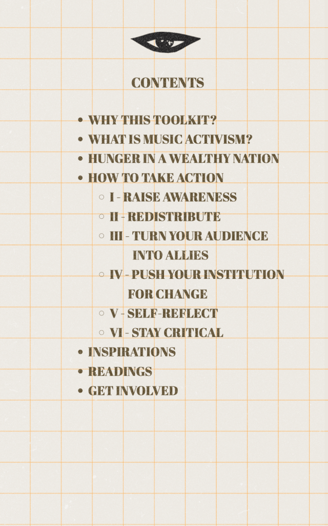 The flyer was both a visual anchor and a call to action. Its design juxtaposed statistics with a message: “Around 1 in 13 people in the Netherlands face food insecurity. […] Let the sound move beyond this room. Keep giving, keep sharing, keep creating change.” Printed on blank postcards, the flyer summarized the purpose of the concert, explained where donations would go, and linked, via QR code, to the digital Toolkit for Music Activists. The toolkit expanded on the flyer’s spirit, offering six concrete pathways for musicians who want to align their practice with social change: