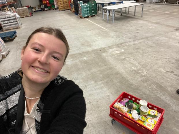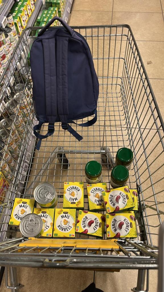 The performance included a digital donation link (Tikkie), through which classmates contributed money. In total we raised €80, which Maike used to buy groceries listed by the food bank (tea, coffee, beans, milk, canned vegetables, and other essentials). She transported three heavy bags of goods on her bicycle to the donation centre in Nijmegen. The volunteer who welcomed her was surprised and delighted. Inside the hall, surrounded by shelves of donated products from supermarkets and individuals, the scale of need became tangible. Through this process, we learned that activism is logistical as much as emotional. Planning, shopping, and cycling with heavy bags were as much part of the performance as the music itself. The project thus unfolded on multiple levels:
