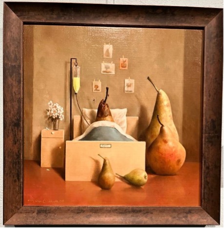 Het eerste schilderij dat me begon te overtuigen van Van Dokkum als kunstenaar, was Anatomische les – waarin hij door middel van realistisch geschilderde peren een eigentijdse draai gaf aan het gelijknamige werk van Rembrandt. Het schilderij is een onderdeel van Van Dokkums serie met peren, waarbij hij deze vrucht gebruikt om allerlei herkenbare sociale situaties uit te beelden. Door hun bolle ‘buik’ zijn ze volgens de kunstenaar “een toonbeeld van welvaart, passend in onze tijd”.[3] De gelijkenissen tussen peren en personen zijn inderdaad treffend.