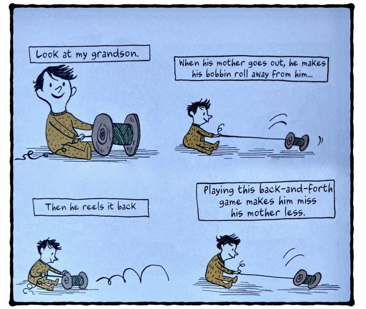 To understand the causes of this sense of pleasure mingled with shame, one might turn to Sigmund Freud’s Beyond the Pleasure Principle (Jenseits des Lustprinzips 1920). In this text, Freud tackles various negative drives by which the ‘normal’ working of our mental lives is disrupted. One of these drives is the compulsion to repeat, which is characteristic of traumatic neurosis. In his examination of this compulsion, Freud describes a game played by his grandson Ernest. As the following image from Anne Simon and Corinne Maier’s Freud: An Illustrated Biography (2013) nicely shows, Ernest would throw objects out of his cot and then reel them back in. Left to his own devices, because his father had gone to the front and his mother had other duties to attend to, this game occupied him for hours on end. Freud posits that Ernest’s compulsion to repeat is a good example of displacement: the object’s disappearance reenacts his mother’s disappearance. In other words, the young boy plays the game because it allows him to imagine his mother’s departure and eventual return, thus giving him the pleasurable experience of representation and imitation. Probing into the origins of this sense of pleasure, Freud offers two interrelated explanations that complicate what may seem an innocent hypothesis. On the one hand, Freud reflects that the game allows the boy to assert a level of control that he does not have in reality, thus transforming him from victim to master of the situation. On the other hand, Freud speculates that the child may be trying to articulate a vengeful, aggressive response that he must repress in ordinary life, that of actively rejecting his mother. Freud’s theory, then, offers us at least one reason why we play videogames: to immerse ourselves in substitute worlds from which we are normally excluded and where, possibly, we can act our aggressive, destructive instincts.