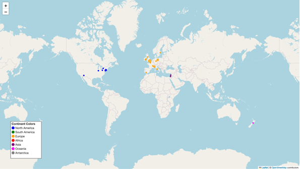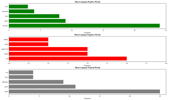 Charts and maps serve as the primary visualisation methods. Knowledge visualisation effectively communicates research to the public, supports integrated learning on complex problems, and nurtures relational perception (Boehnert, 2016). Python code is used to map the locations of record labels involved in fundraising for Gaza by assigning geographic coordinates and continent-based colours. The data is dynamically visualised on a Folium map to display location frequencies, while word frequencies, bigrams, and sentiment analysis are visualised through bar charts generated by Matplotlib.