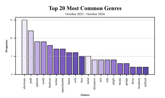 Distant reading of the tags labelling the albums and compilations sold to raise funds for Gaza shows that the highly contested category of “world music” ranks among the top four genres, following punk, a genre often associated with political protest and disobedience. Connell and Gibson (2004: 346) describe world music as a commercial construct that emerged in 1987 as a marketing strategy rather than an authentic genre tied to specific places. Historically, it served as a vague label for non-European and marginalised music, creating a division from other genres (Van Klyton, 2012). This divide enables Western corporations to profit by exoticising non-Western sounds and packaging them for global consumption (Connell and Gibson, 2004; Van Klyton, 2012). At its core, world music reflects the impact of globalised markets, where cultural products are detached from their geographic origins and recontextualised for Western audiences, which reinforces a Eurocentric framing of diverse cultural expressions and identities.