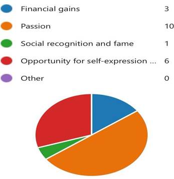When interrogating the primary motivations driving young people in Ghana to participate actively in the creative industries, passion appeared to be a common motivator for most of the participants. Ten of the participants are motivated by their passion for creativity. This represents 50% of the sample size. Following closely is the desire for self-expression as expressed by six participants (30%). It appears financial reward is not a major source of motivation for young creatives, however surprising this appears, only 15% of the sample size consider finances as a motivation for participation. This reveals the diverse levels of motivation among young people in the creative industries in Ghana.