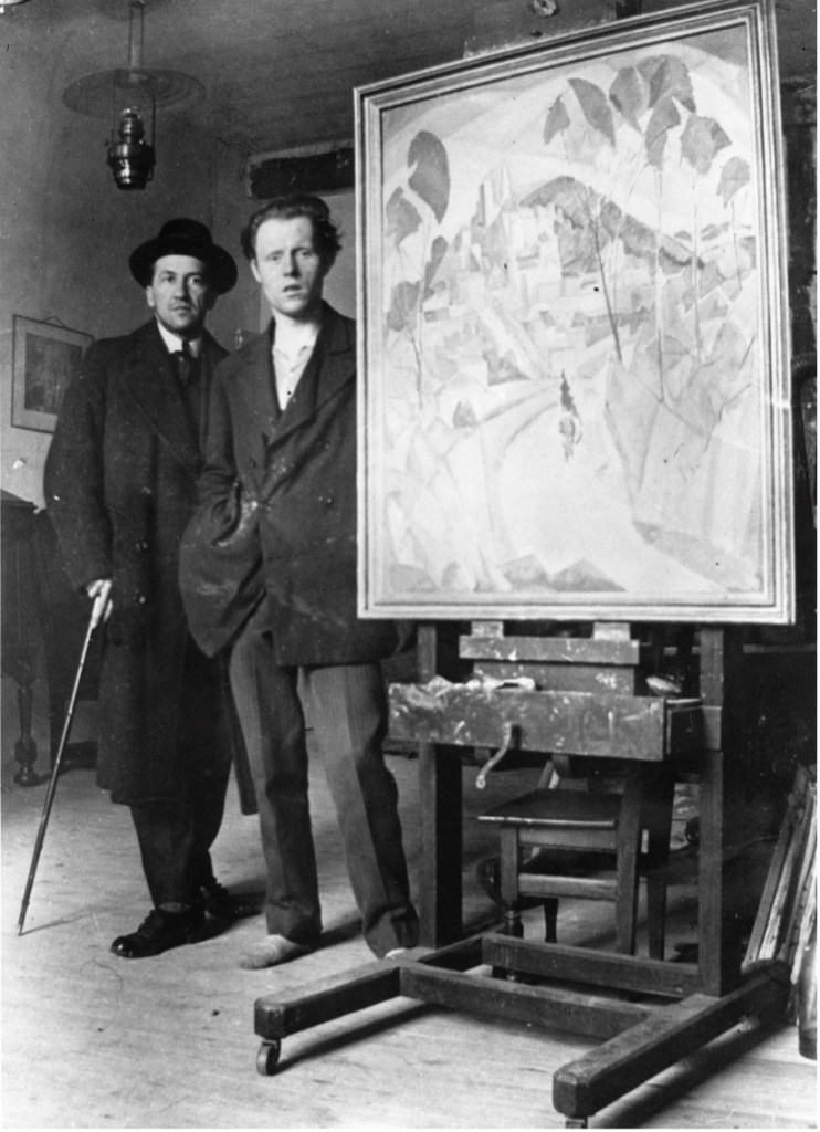 Foto genomen door Conrad Kickert in zijn atelier. We zien Schelfhout en Mondriaan (met hoed) naast een werk van Schelfhout staan.